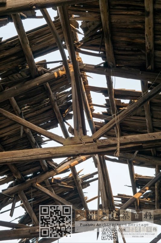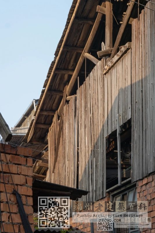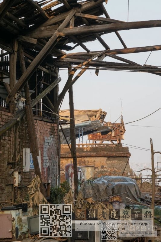 2、船体车间:厂区临江处为纯木构造船车间,木构屋顶损毁严重,仅余4跨,木构屋面结构形式为两支点木屋架形式,山墙面上部为竖木板固定封面,墙身为红砖砌筑结构; 福州厝