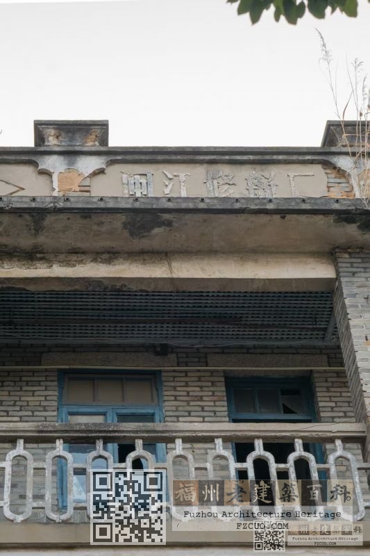 1、厂区核心区:厂区主入口现存木质大门及门卫室,门卫室后方仍残存有“此地严禁烧汤煎油”字样,厂区现存一大约建设于70年代后期的厂部建筑,建筑平面呈L形平面,建筑体含一栋东西向3层青砖楼,屋顶女儿墙装饰有方胜纹线条,女儿墙正中央有“闽江修船厂”字样,疑似厂区宿舍楼;及一栋南北朝向的2层青砖楼,为厂部办公建筑;目前厂部园区内的建筑作为原厂职工居住区,局部建筑对外出租,其余建筑不同程度空置; 福州老建筑百科(fzcuo.com)